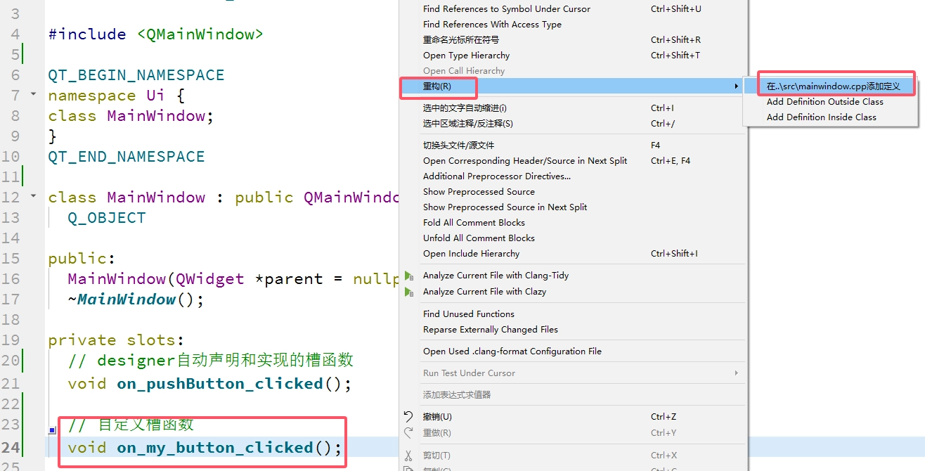 mainwindow.cpp中实现该函数(可以在mainwindow.h中点击该函数,右键->重构->添加,快速生成)